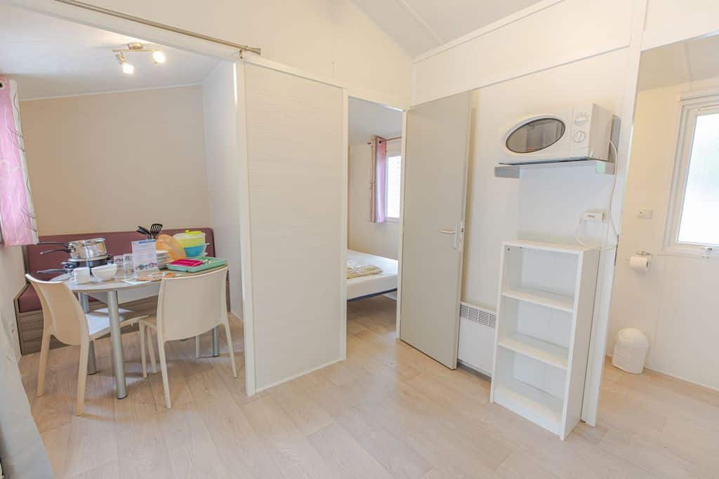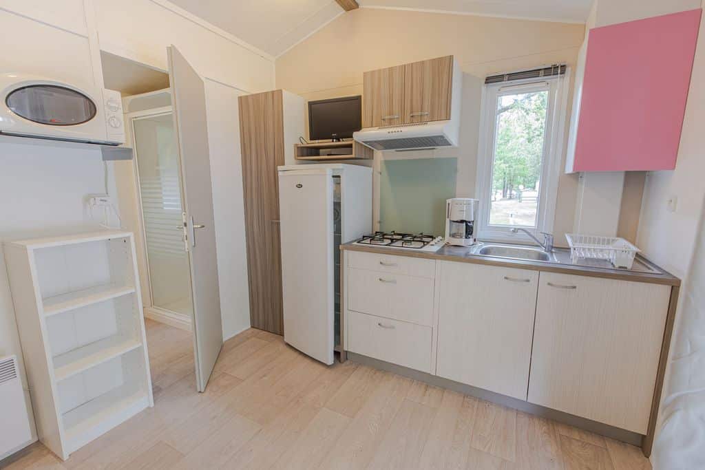 • Cuisine: réfrigérateur, plaque de cuisson 4 feux, hotte aspirante, évier avec eau chaude/eau froide, micro-ondes.