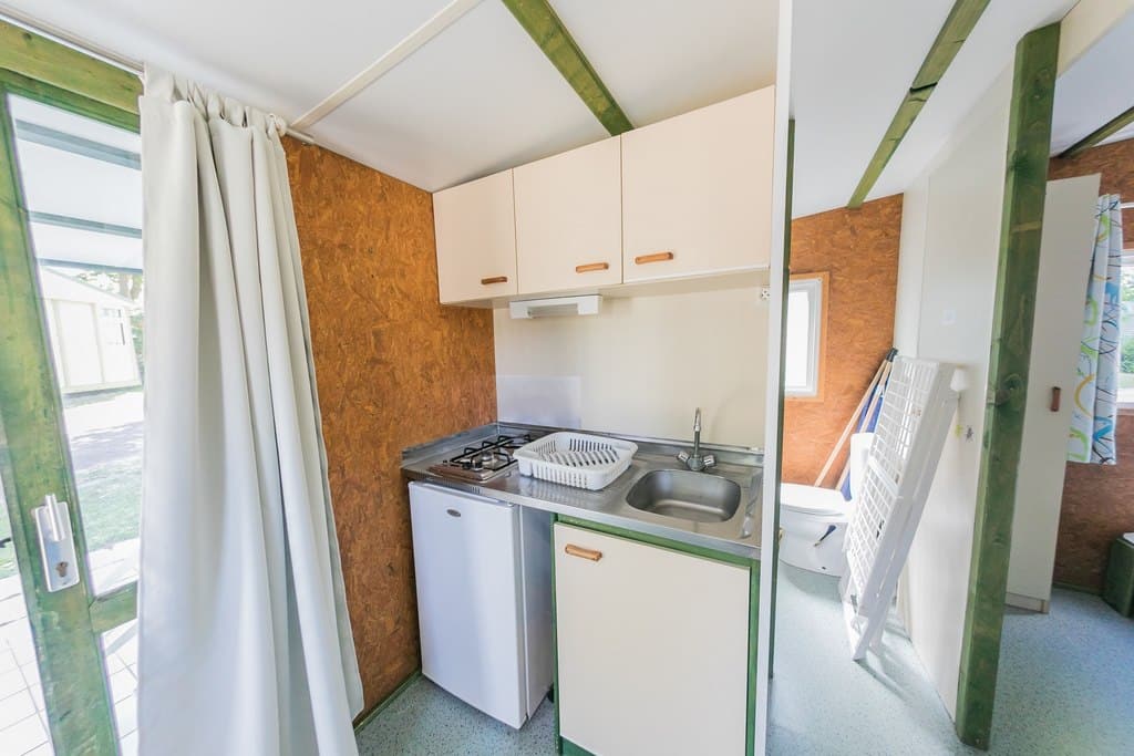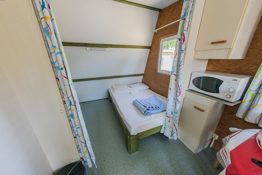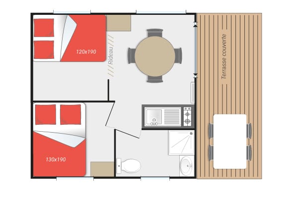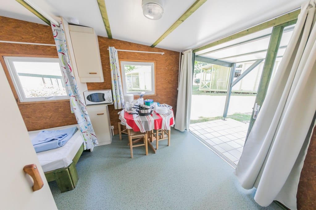 Pour des vacances entre amis ou en famille, choisissez une location de chalet 4 personnes en Charente Maritime et découvrez notre chalet Campeco ! Disposant de 2 chambres, dont une séparée par un grand rideau, tous les vacanciers auront leur espace nuit.
