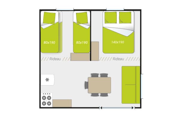 Le bungalow toilé est un bon compromis entre la tente et le mobil-home. En totale connexion avec la nature, sans perdre le confort d’un mobil-home, ce type d’hébergement est idéal pour les personnes souhaitant retrouver l’ambiance de la vie en plein air. Si vous aimez les valeurs du camping, alors les bungalows toilés sont l’hébergement fait pour vous. Vous disposez de l’équipement nécessaire au bon déroulement de votre séjour : un coin cuisine, deux chambres, un salon et une terrasse couverte. A proximité directe, vous avez accès au bloc sanitaire.