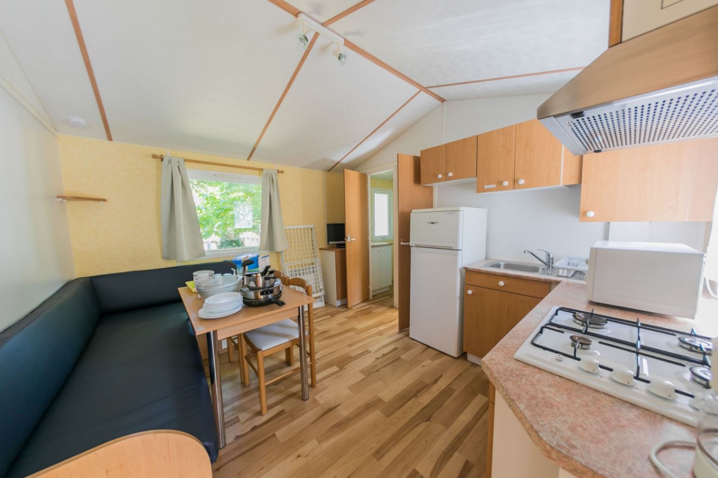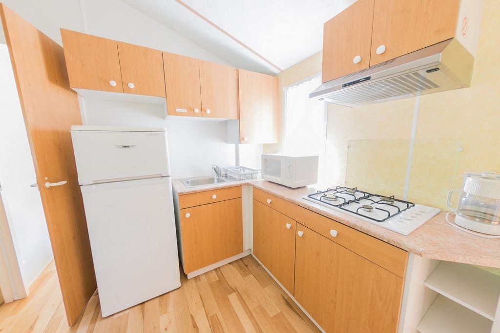 • Cuisine en L : réfrigérateur-congélateur, plaque de cuisson 4 feux , hotte aspirante, 1 évier avec eau chaude / eau froide, micro-ondes.