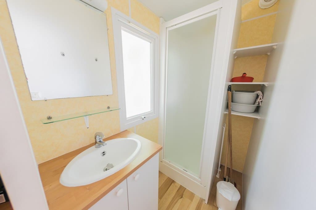 • Douche, lavabo, porte-serviettes, porte-vêtements, étagères, WC séparé.
